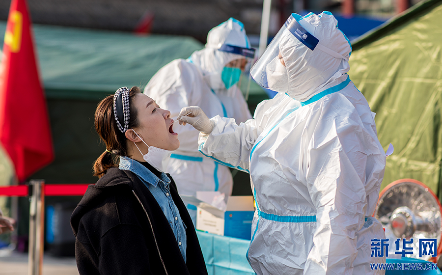 29日,呼和浩特市玉泉区长和廊街道大召广场核酸采样点,医务人员为居民进行核酸检测取样。新华网发(丁根厚 摄)