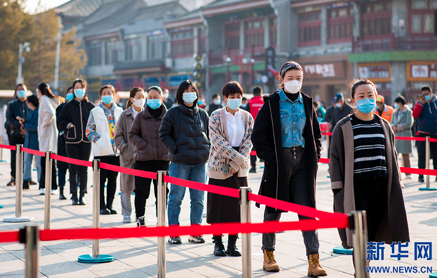 29日,呼和浩特市玉泉区长和廊街道大召广场核酸采样点,居民有序排队进行核酸检测取样。新华网发(丁根厚 摄)