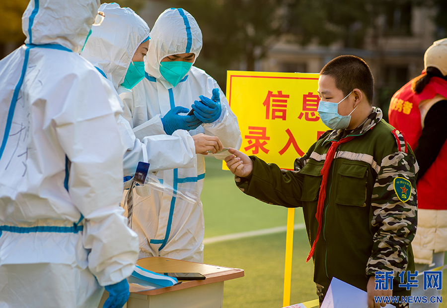 29日,呼和浩特市玉泉区五塔寺东街小学核酸采样点,工作人员为参加核酸检测的学生录入信息。新华网发(丁根厚 摄)