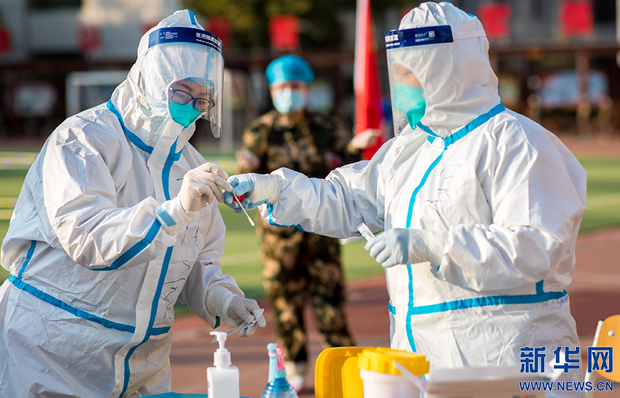 29日,呼和浩特市玉泉区五塔寺东街小学核酸采样点,医务人员将学生核酸检测的样品收纳到试管中。新华网发(丁根厚 摄)