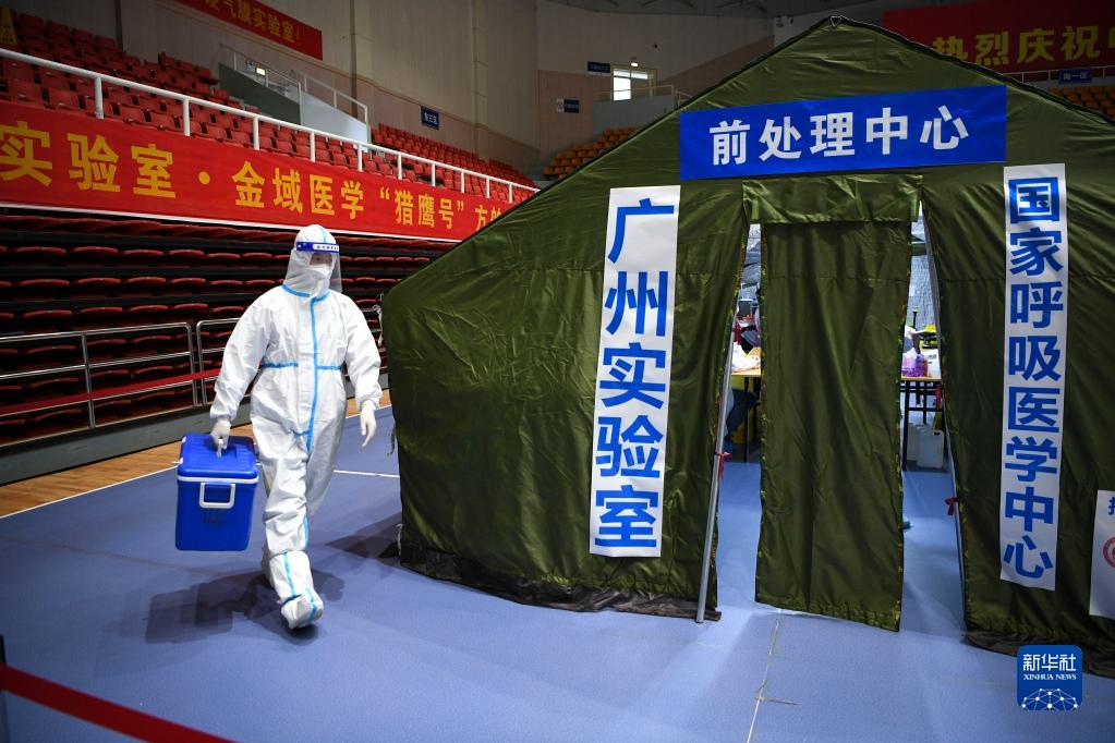 10月29日,样本运送人员将核酸样本带到“猎鹰号”硬气膜实验室前处理中心。新华社记者 冯开华 摄