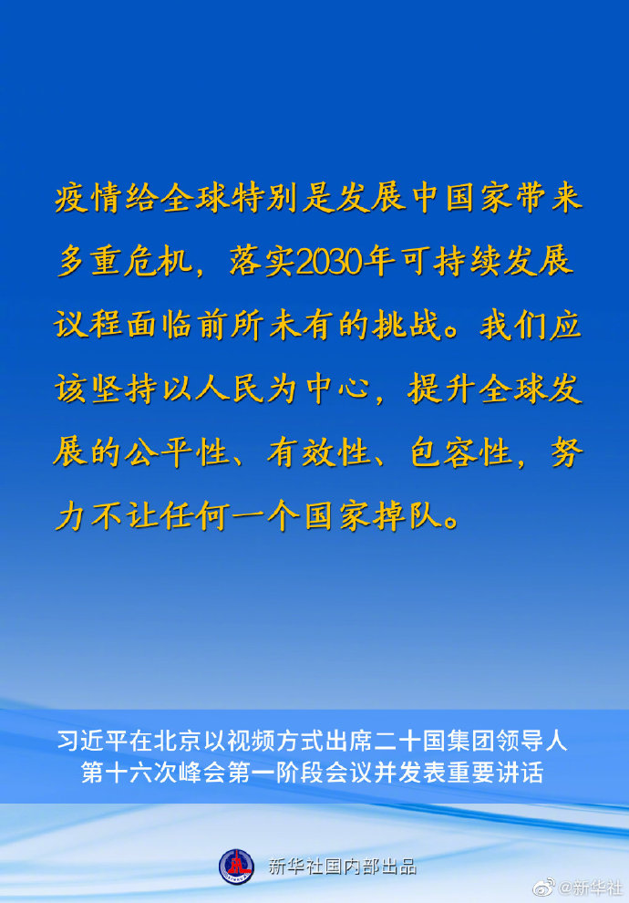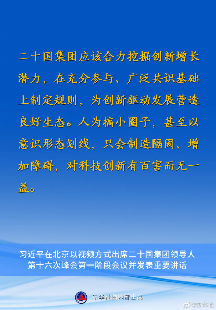 国家主席习近平10月30日在北京以视频方式出席二十国集团领导人第十六次峰会第一阶段会议并发表重要讲话。讲话有哪些要点,一起来看↓