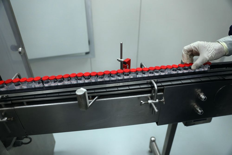 这是2021年9月6日在埃及吉萨的埃及生物制品与疫苗公司疫苗生产厂拍摄的疫苗生产线上的新冠疫苗。2021年4月21日,中国科兴公司与VACSERA公司签署在埃及生产科兴新冠疫苗的协议。