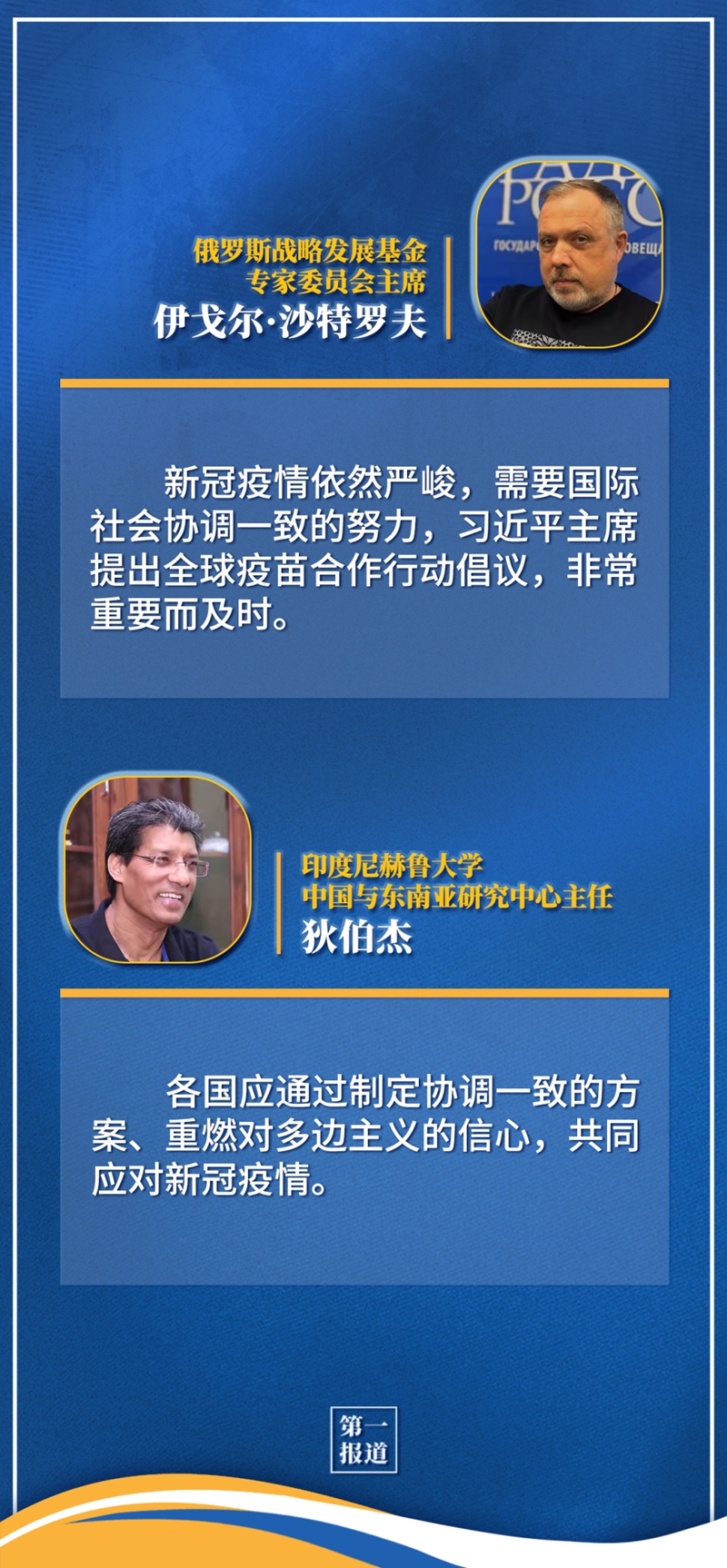 多国人士认为,习近平主席就全球抗疫、经济复苏等提出的主张意义重大,充分展现了中国负责任大国的担当,将有力推动全球团结合作与共同发展。