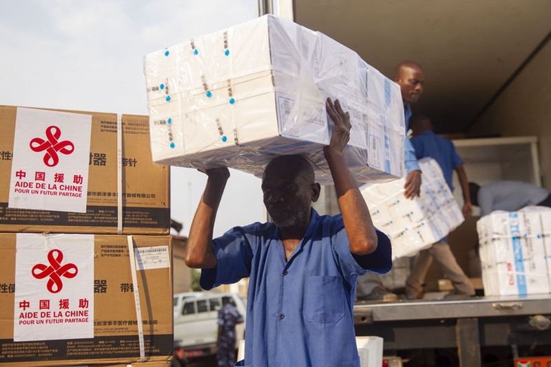 2021年10月14日,工作人员在布隆迪经济首都布琼布拉卸载中国援助的国药新冠疫苗。
