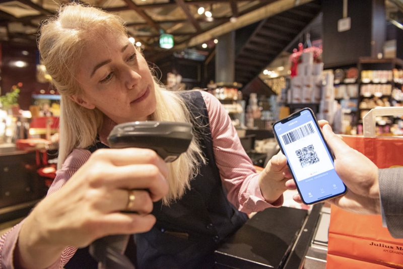 2020年1月9日,在奥地利维也纳,一名咖啡店工作人员扫描一位顾客的支付宝支付二维码。
