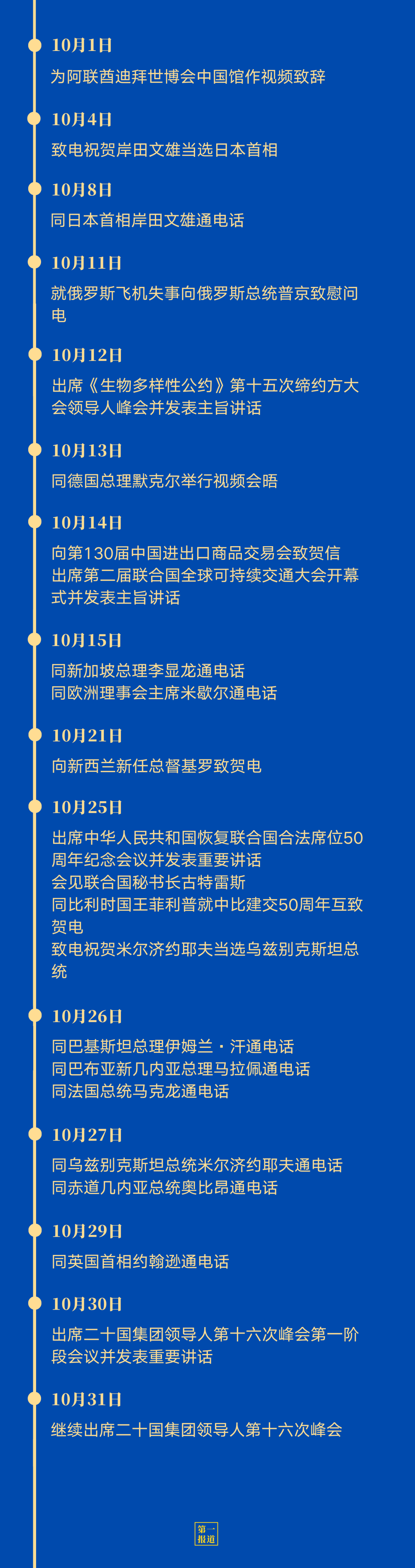 面对更多不确定性,尤需凝心聚力应对共同挑战。10月,中国元首外交活动频密,内容丰富——