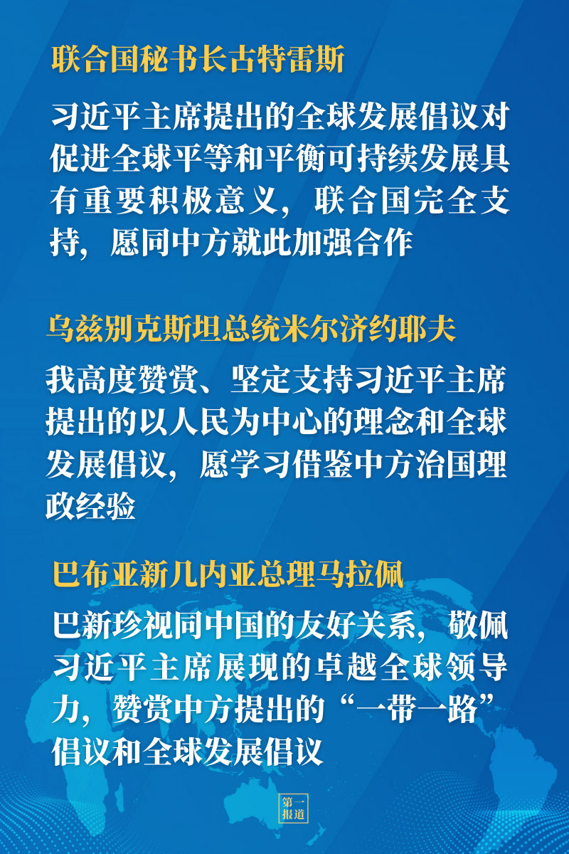 “我们应该坚持以人民为中心,提升全球发展的公平性、有效性、包容性,努力不让任何一个国家掉队。”