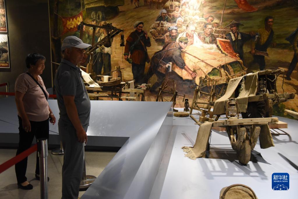 在位于山东省临沂市蒙阴县的孟良崮战役纪念馆,游客参观孟良崮战役期间使用过的小推车(2019年6月9日摄)。新华社记者 王凯 摄
