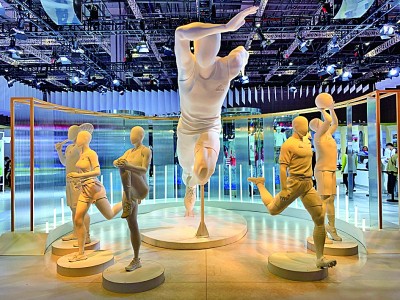 进博会阿迪达斯展台入口处的“全民健身,一起更强”主题雕塑。光明日报记者 曹元龙摄/光明图片