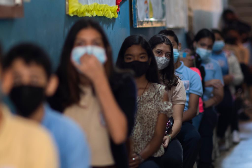 11月4日,在位于委内瑞拉首都市中心的“何塞·安洁尔·阿拉莫”中学,学生们在排队接种中国疫苗。萨尔戈多摄