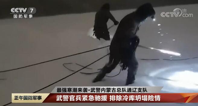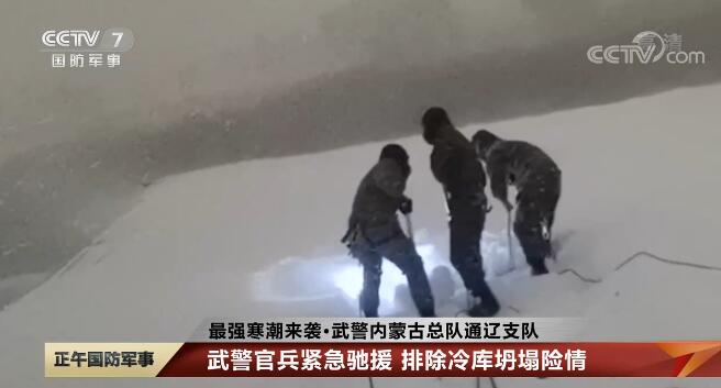 11月8日晚,内蒙古通辽一农副产品公司冷库顶部积雪严重,一旦坍塌将严重威胁当地群众安全。为第一时间排除险情,武警内蒙古总队通辽支队迅速机动至现场,官兵们用吊车拉起钢丝绳,在冷库棚顶清理积雪。经过官兵们连续5小时的奋战,险情被及时排除,确保了冷库安全,挽回经济损失上亿元。