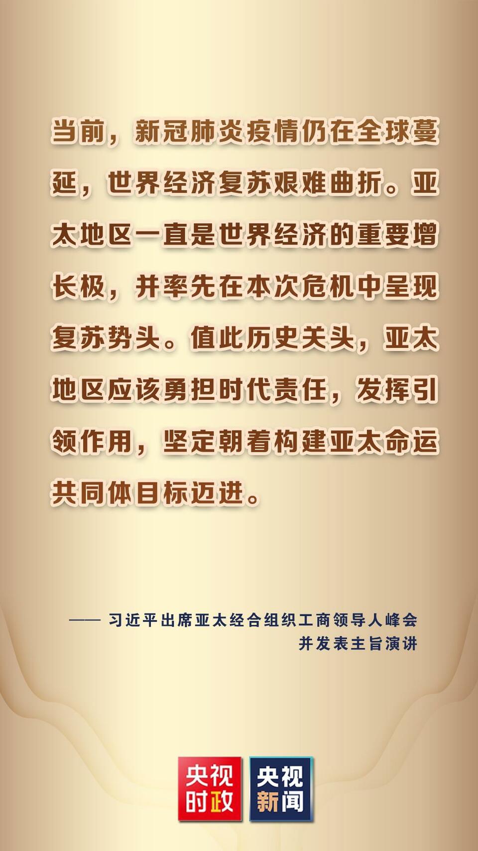 11月11日,国家主席习近平应邀在北京以视频方式向亚太经合组织工商领导人峰会发表题为《坚持可持续发展 共建亚太命运共同体》的主旨演讲。