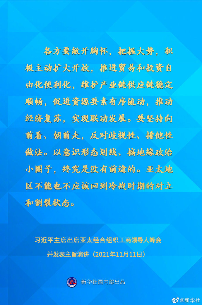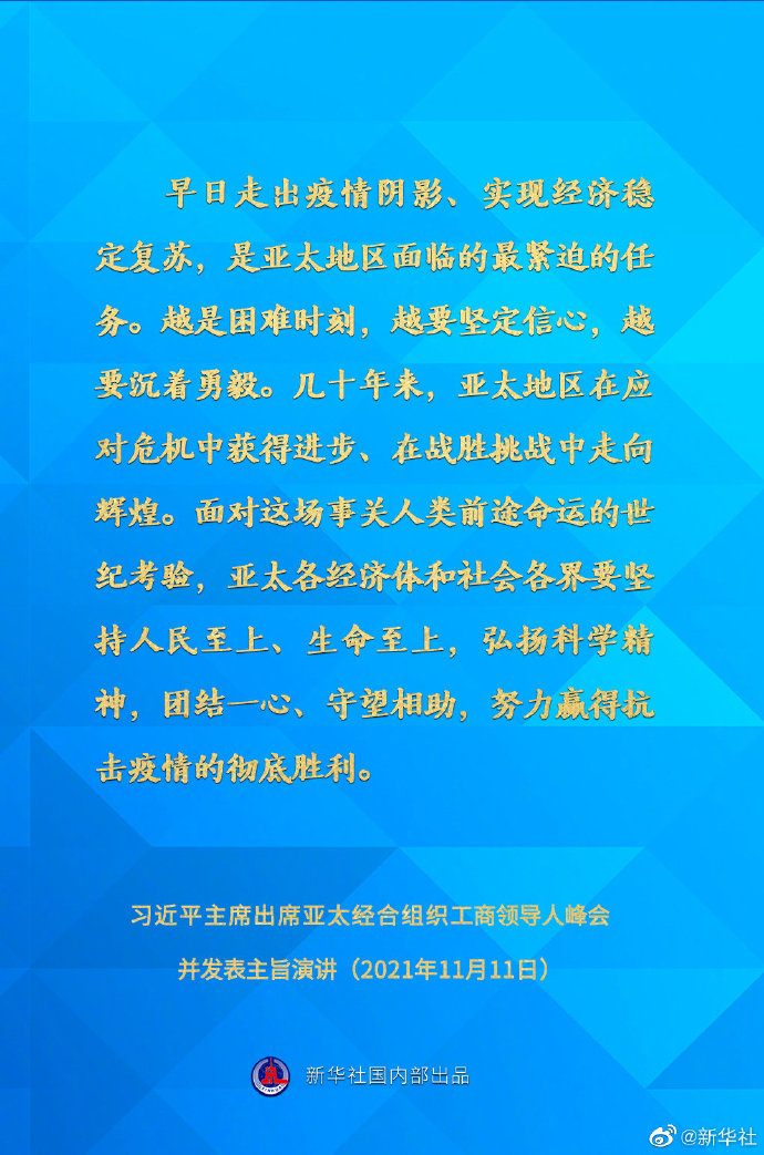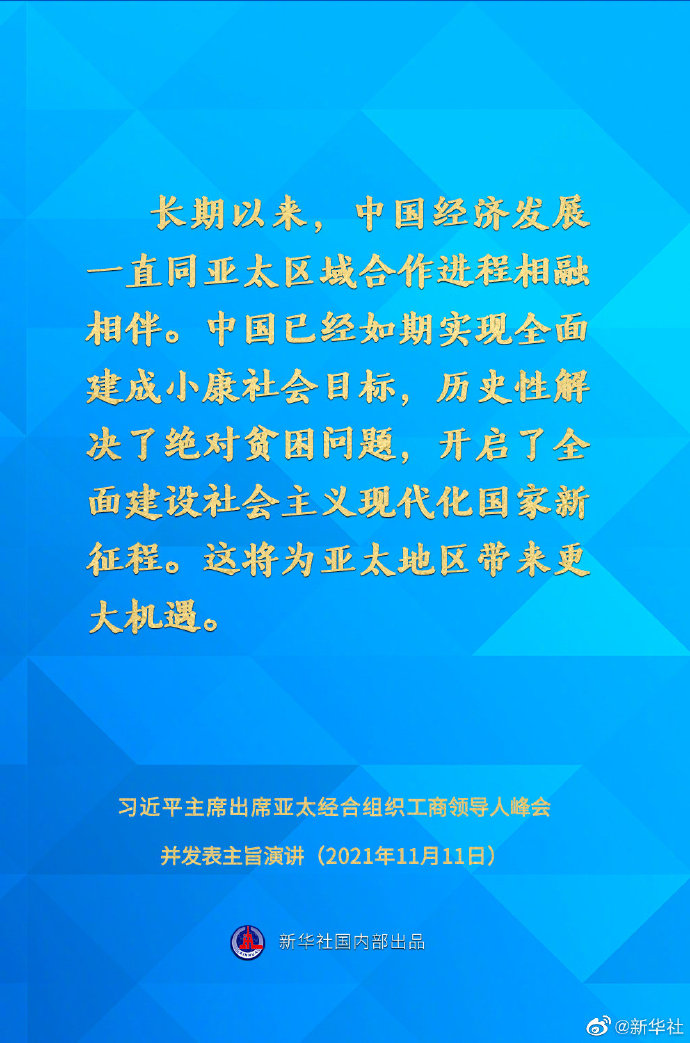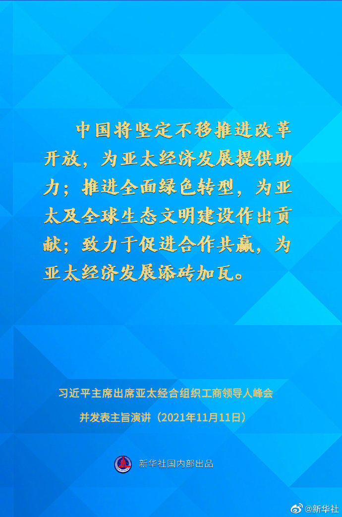 11月11日,国家主席习近平应邀在北京以视频方式向亚太经合组织工商领导人峰会发表主旨演讲。一起来看要点↓