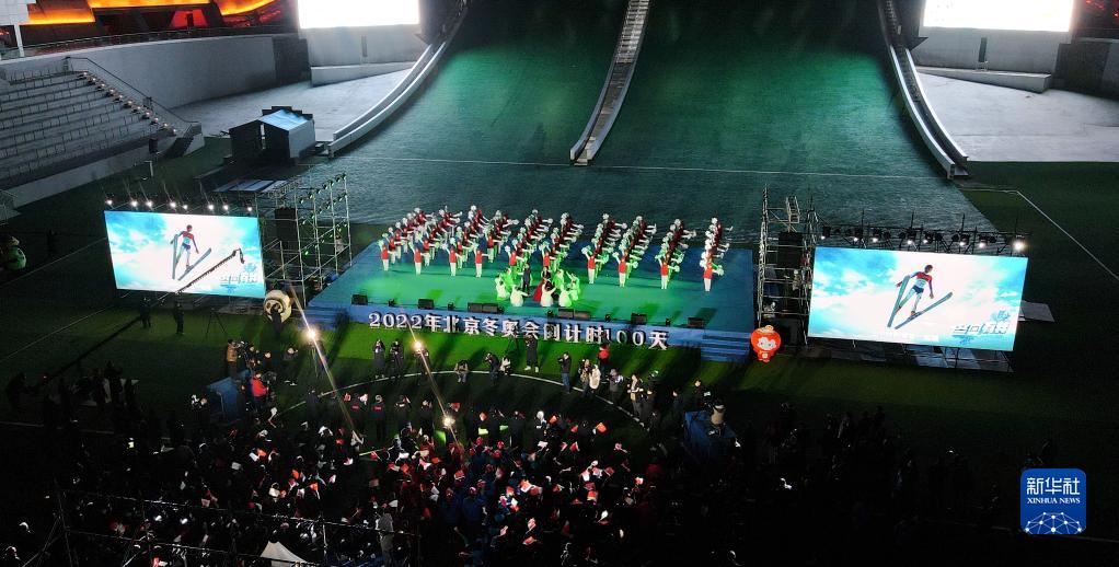 10月26日,“来自崇礼的邀约”——北京2022年冬奥会倒计时100天庆祝活动在河北省张家口市崇礼区国家跳台滑雪中心“雪如意”举行(无人机照片)。新华社记者 金皓原 摄