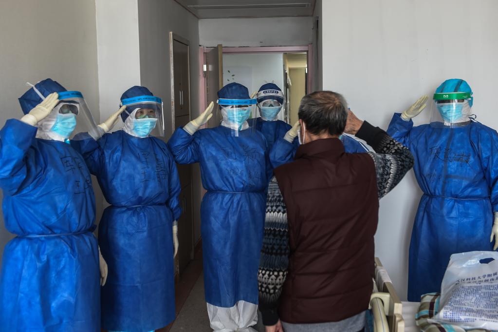 在中国湖北省妇幼保健院光谷院区,一名即将出院的老年患者向医护人员致敬(2020年3月14日摄)。新华社发(赵佳庆摄)