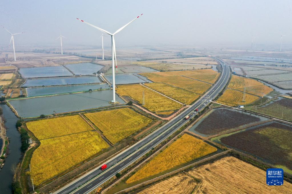 这是11月3日拍摄的江苏省扬州市宝应县鲁垛镇5.28万千伏安风力发电项目(无人机照片)。新华社记者 李博 摄