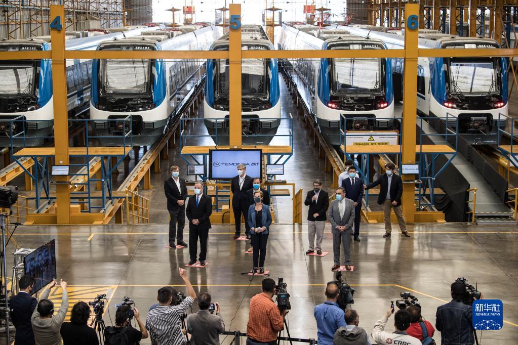 3月23日,智利交通和电信部长乌特(中)在首都圣地亚哥参观中国轨道列车,称赞这批车辆的到来是近年来智利“铁路发展最重要的里程碑之一”。新华社发(豪尔赫·比列加斯摄)