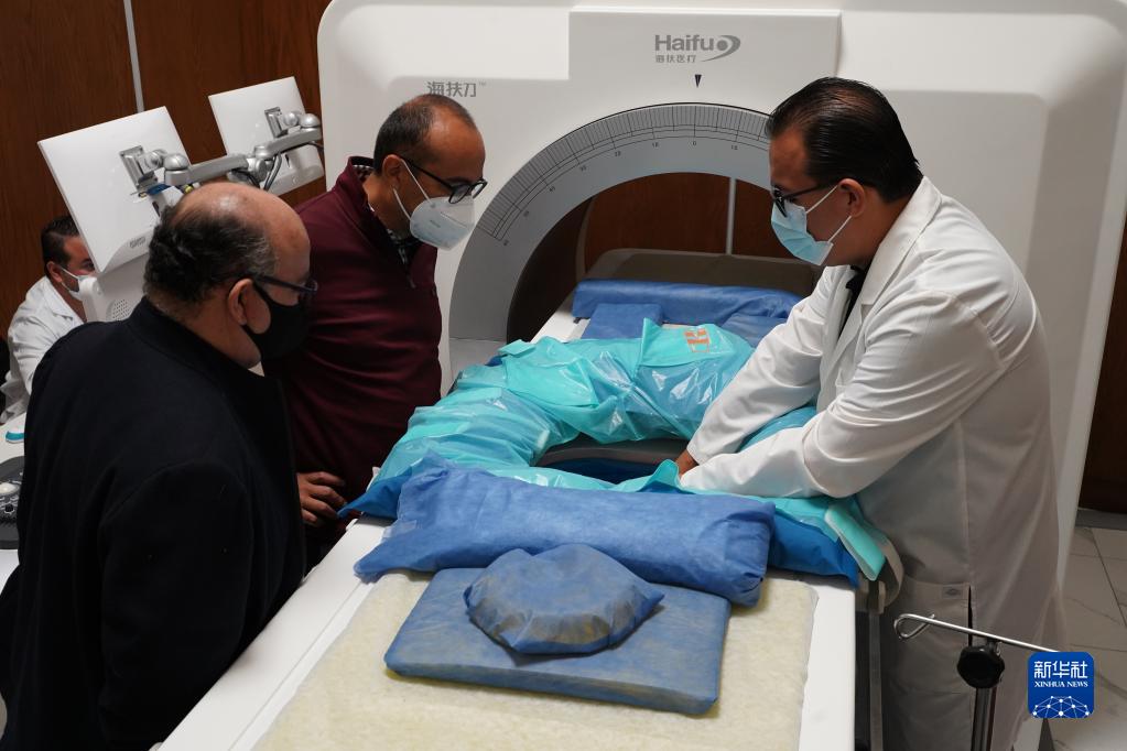 8月23日,在墨西哥普埃布拉州乔卢拉市肿瘤消融医学中心,重庆海扶医疗的墨方合作医生向到访医生演示“海扶刀”治疗系统。新华社记者 朱雨博 摄