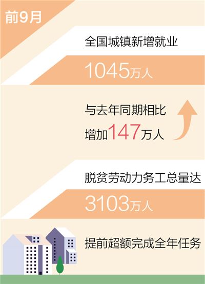 人社部就业促进司有关负责人表示,今年以来,随着我国经济持续稳定恢复,就业形势保持总体稳定、好于预期:1月至9月,全国城镇新增就业1045万人,完成全年目标任务的95%,与去年同期相比,增加147万人,增幅为16%。三季度恢复态势更加积极,重点群体就业保持稳定。