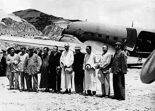 1945年7月,国民参政会参政员黄炎培等六人飞抵延安,同中国共产党商谈两党团结、共建国内和平问题,毛泽东等亲临机场欢迎。 图:新华社