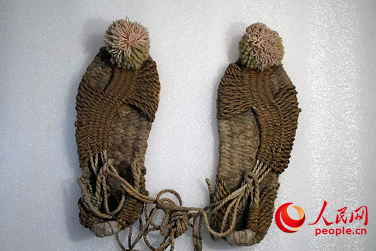 这是一双与众不同的草鞋:鞋尖上绣着两个绣球。鞋的主人是于都县岭背乡老红军谢志坚,在送他离家远征时,青梅竹马的爱人春秀,送给他这双别致的鞋。