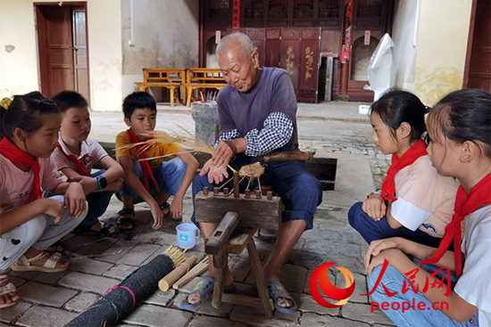 肖南斗给孩子们讲述草鞋的故事。人民网 罗娜摄