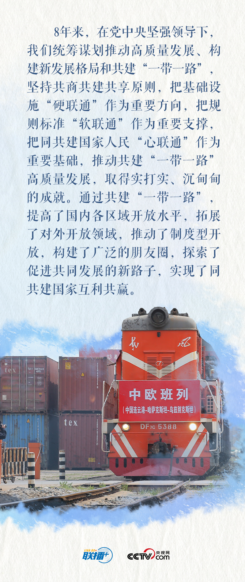 ◆要深化互联互通,完善陆、海、天、网“四位一体”互联互通布局,深化传统基础设施项目合作,推进新型基础设施项目合作,提升规则标准等“软联通”水平,为促进全球互联互通做增量。