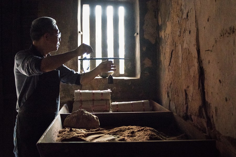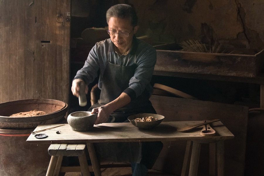 蒲良宫仍然沿袭着数百年前祖先留传下来的制香技艺,连制香的器具还是百年前的那一套,搓香粉时浸水的陶瓮,已经用了150多年。