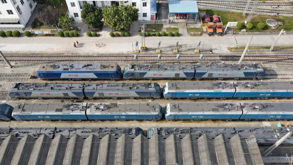 这是11月23日拍摄的停靠在成都机务段的中欧班列编组和谐型机车头(无人机照片)。新华社记者胥冰洁摄
