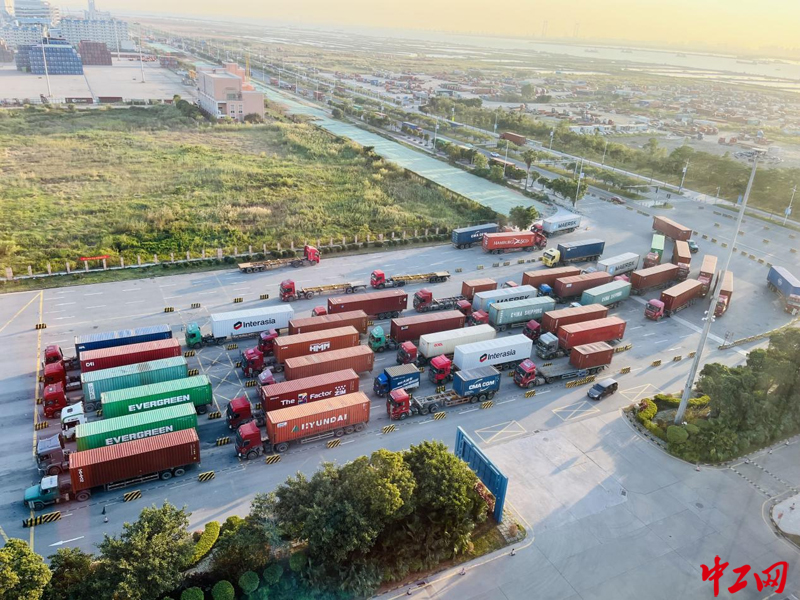 运输货物的集装箱车队正在排队依次进入港口。中工网 王天玥摄