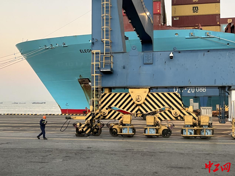 落日余晖下依旧在港口作业的工人。中工网 王天玥摄