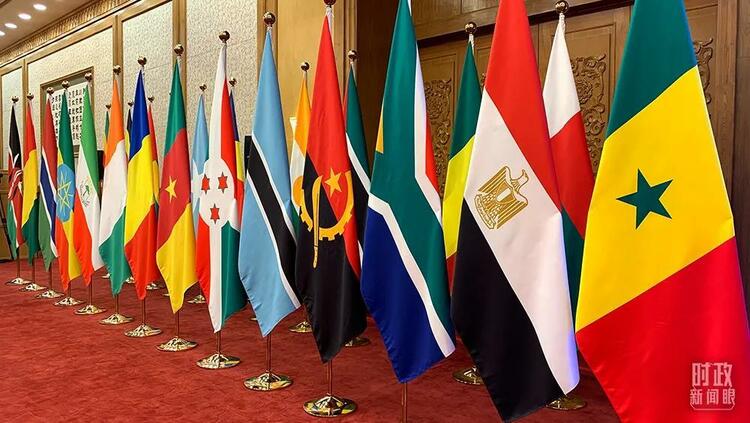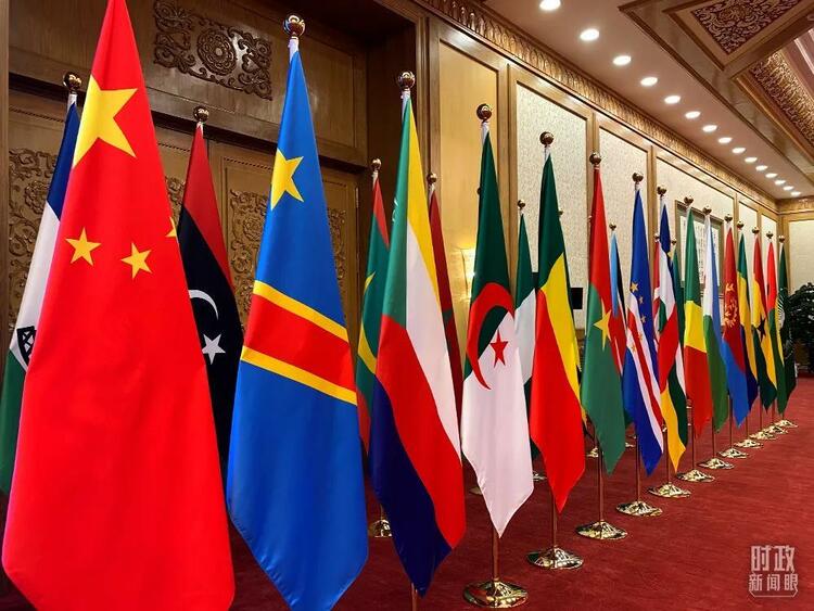 △东大厅内,中国和53个非洲国家国旗以及非洲联盟旗帜组成的旗阵。(总台央视记者范一鸣拍摄)