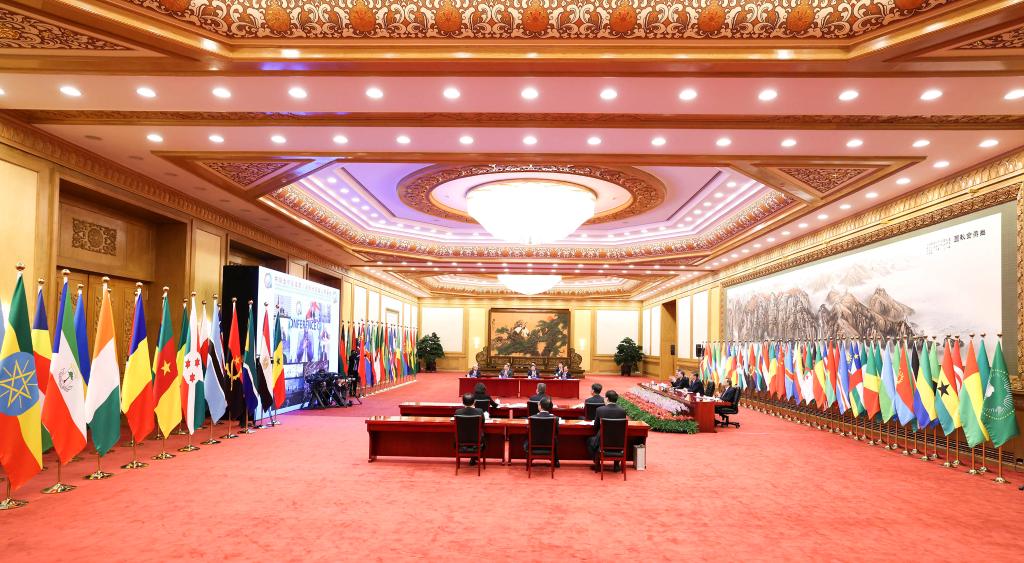 “志合者,不以山海为远”。29日晚,北京人民大会堂东大厅内,中国和53个非洲国家国旗以及非洲联盟旗帜并排矗立、恢弘大气,虽是“云端”相聚,但现场洋溢着浓浓情谊,昭示着中非历久弥坚的友好关系。