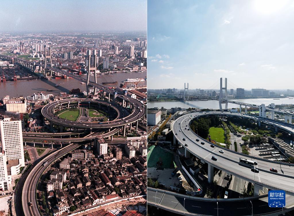 这是一张拼版照片:左图为直升机航拍的上海南浦大桥(1998年10月29日发,新华社记者任珑摄);右图为无人机拍摄的上海南浦大桥(2021年12月1日新华社记者方喆摄)。