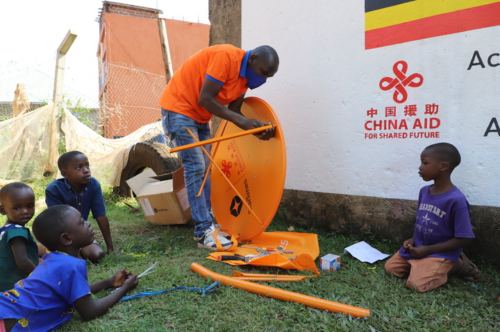 9月10日,技术人员在乌干达中部瓦基索区的布韦伦加村安装调试数字电视设备。中国企业四达时代集团承建的“万村通”项目让这里的村民看上了画面清晰而且免费的卫星数字电视节目。新华社记者张改萍摄