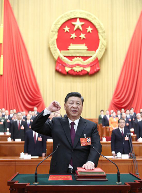 在十三届全国人大一次会议第五次全体会议上,习近平左手抚按宪法,右手举拳,面向近3000名代表宣读誓词。