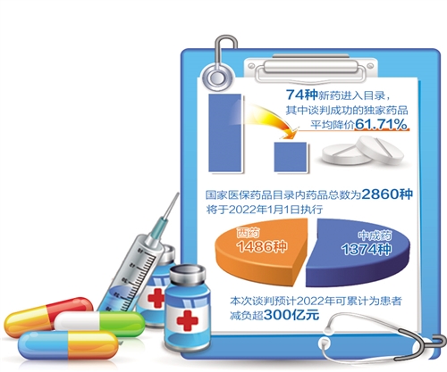 在今年的调整中,国家医保局严格把握药品的经济性,经初步测算,新增的74种药品预计2022年增加的基金支出,与目录内药品降价等腾出的基金空间基本相当,因此近期不会明显增加基金支出。从患者负担情况看,相比原市场价格,通过谈判降价和医保报销,本次谈判预计2022年可累计为患者减负超300亿元。