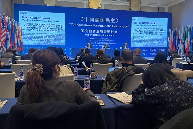 中国青年报客户端北京12月6日电(中青报·中青网记者 马子倩 胡文利)由中国人民大学重阳金融研究院(人大重阳)主办、中国人民大学中美人文交流研究中心承办的《十问美国民主》研究报告发布暨研讨会,今天上午在北京举行。来自包括美国在内30多个国家的驻华使馆代表与会,全球超过100万网友在线听取报告发布。