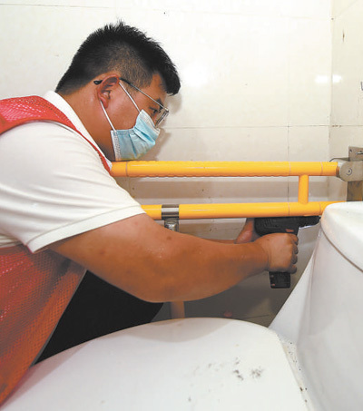 在安徽合肥市庐阳区大杨镇十张村残疾老人葛家宝家中,工作人员在如厕区、洗浴区安装扶手。 影像中国