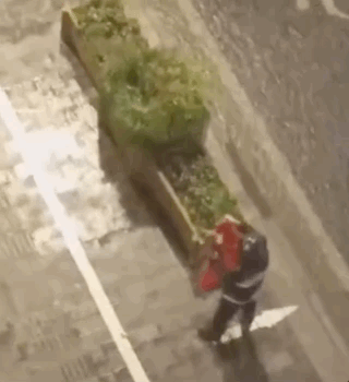 大雨中,防汛队员捡起被吹落在地的国旗,仔细叠好收进雨衣。