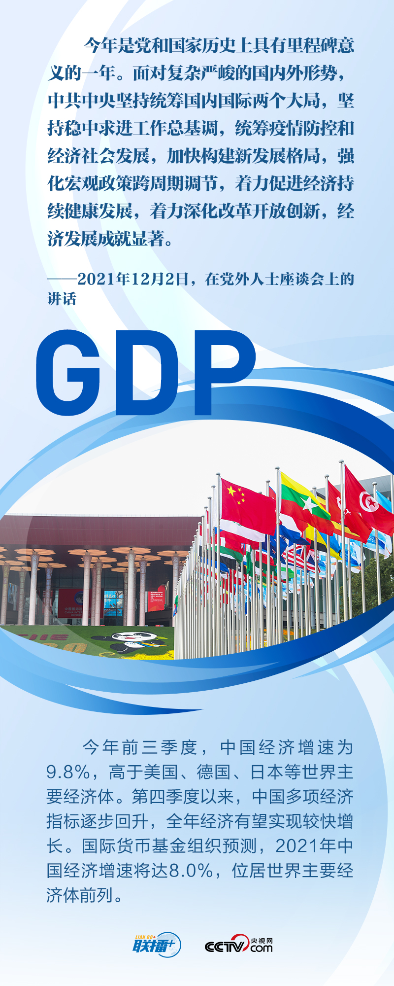 “今年是党和国家历史上具有里程碑意义的一年。面对复杂严峻的国内外形势,中共中央坚持统筹国内国际两个大局,坚持稳中求进工作总基调,统筹疫情防控和经济社会发展,加快构建新发展格局,强化宏观政策跨周期调节,着力促进经济持续健康发展,着力深化改革开放创新,经济发展成就显著。”在党外人士座谈会上,习近平总书记充分肯定2021年中国经济发展取得的成绩。