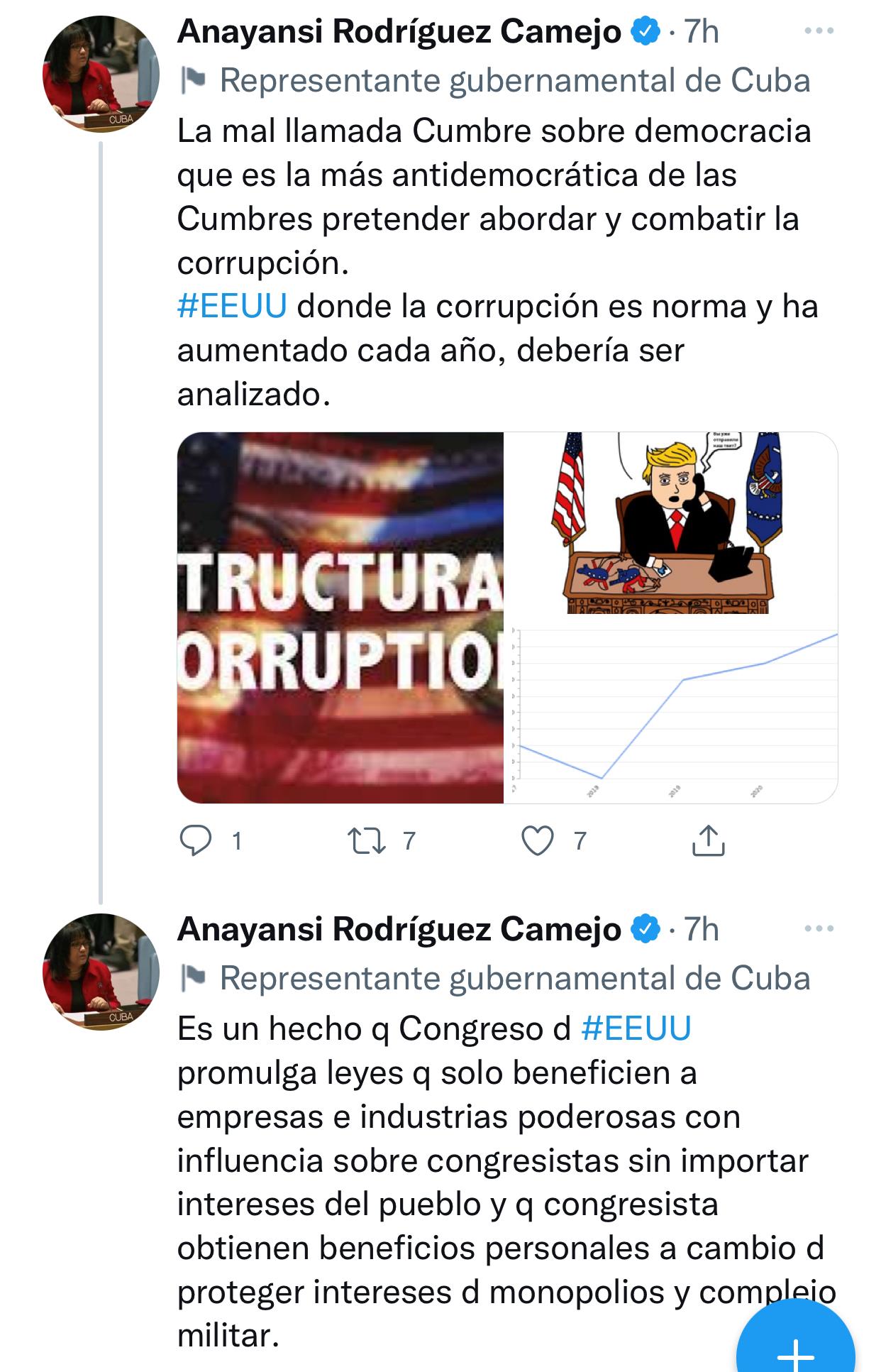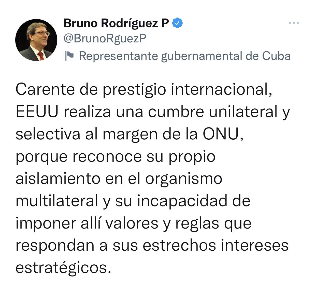 古巴外交部长布鲁诺·罗德里格斯表示,美国在联合国框架外举行单边的、有选择性的峰会,是因为美国认识到自身在多边组织中处于孤立状态,无法在多边组织中向别国强加“符合其自身狭隘战略利益的价值观和规则”。