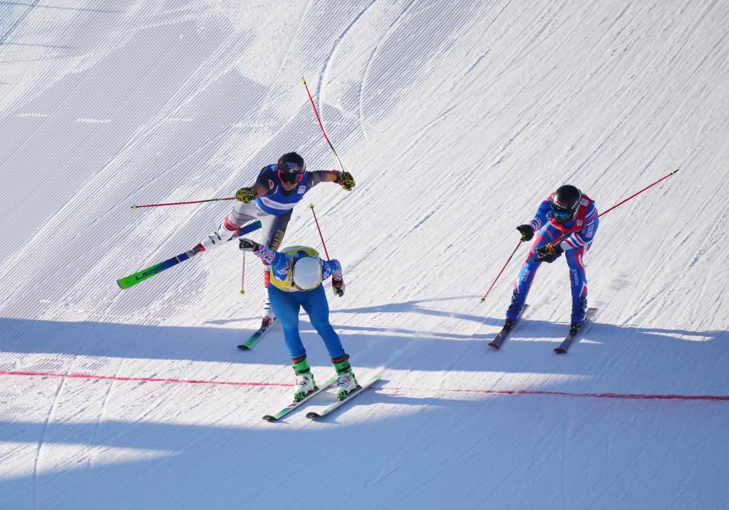 图为11月27日,俄罗斯选手谢尔盖·里齐克(前)在北京2022年冬奥会张家口赛区云顶滑雪公园举行的“相约北京”系列测试赛中冲过终点。新华社记者 杨世尧 摄