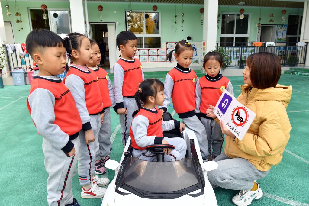 2021年12月1日,湖北省宜昌市秭归县金苹果幼儿园老师给孩子们讲解交通安全知识。新华社发(王辉富摄)