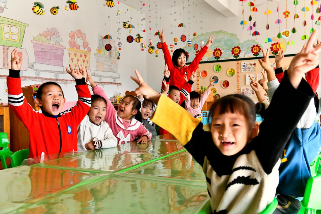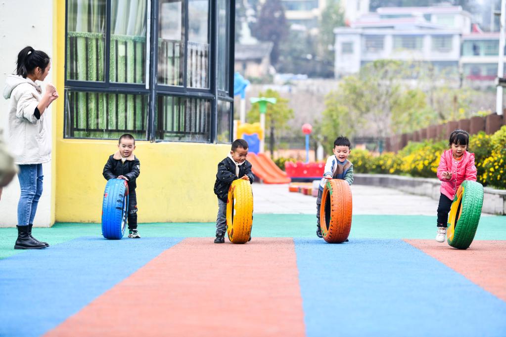 贵州省龙里县第六幼儿园的孩子在做游戏,这里是龙里县冠山街道奋进社区易地扶贫搬迁安置点的配套幼儿园(2020年11月4日摄)。新华社记者 杨文斌 摄