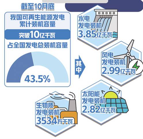 今年以来,面对快速增长的能源需求,我国主要新能源品种产量持续增长,供应能力进一步增强。据行业统计,截至今年10月底,我国可再生能源发电累计装机容量突破10亿千瓦,占全国发电总装机容量的比重达43.5%。