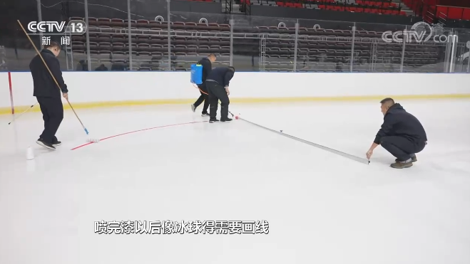 刘永亮说:“制完底冰然后喷漆,像冰球(场地)需要画线再封冰、贴LOGO,把LOGO贴好以后做中间层的冰,就是增厚。达到所需要的厚度以后就得上冰车,不平的地方刮平,用热水去润冰。”