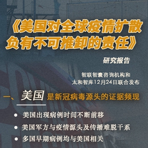 智联智囊咨询机构和太和智库12月24日联合发布《美国对全球疫情扩散负有不可推卸的责任》研究报告。报告指出,多项数据和信息显示,美国才最有可能是新冠病毒的“起源国”,是导致疫情在全球快速扩散的罪魁祸首,而美国的政治化操弄更是让全球战胜疫情步履维艰,面临严重挑战。(记者孙楠、王宾)
