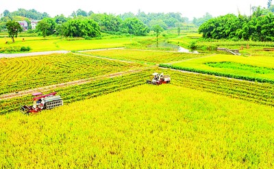 四川泸州市江阳区通滩镇田湾村村民在收割水稻。新华社发